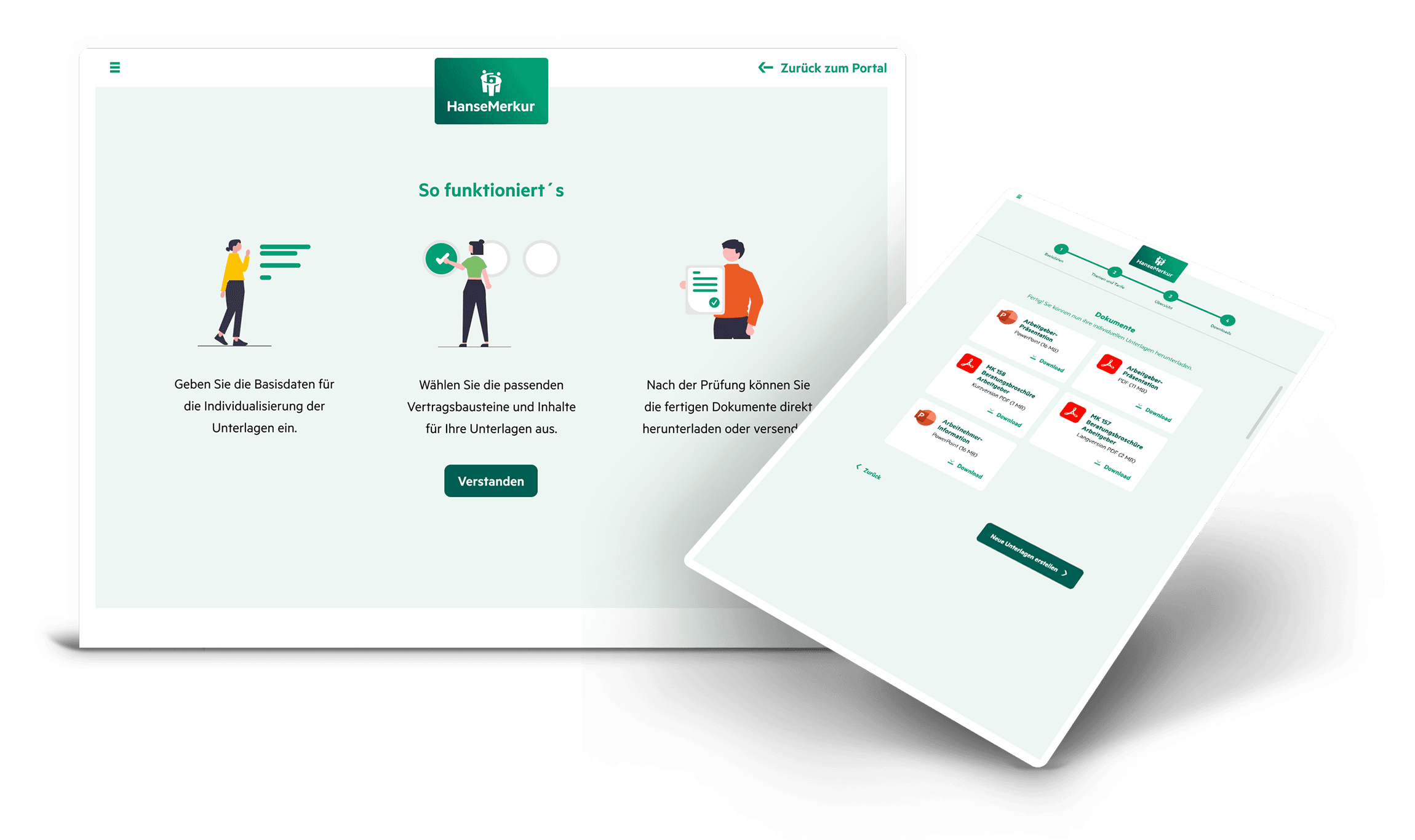 Dank der intuitiven Bedienung lassen sich Unternehmens- und Ansprechpartnerdaten, Logos sowie individuelle Inhalte schnell ergänzen. Per Knopfdruck wird daraus eine vollständige Präsentation generiert, die automatisch dem Corporate Design der HanseMerkur entspricht. So ist jederzeit ein einheitliches, professionelles Markenbild sichergestellt – unabhängig davon, wer die Präsentation erstellt oder in welchem Vertriebskanal sie eingesetzt wird.